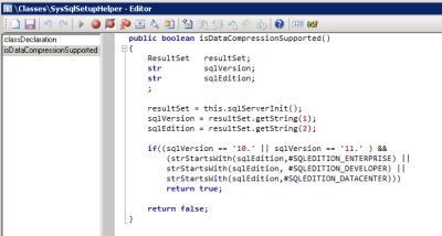The class SysSQLSetupHelper checks the SQL version and the controls on the form SysSQLSetup are enabled or disabled based on that. Luckily the fix for this is very easy – check whether the SQL version is 10 OR 11 (2008 OR 2012).