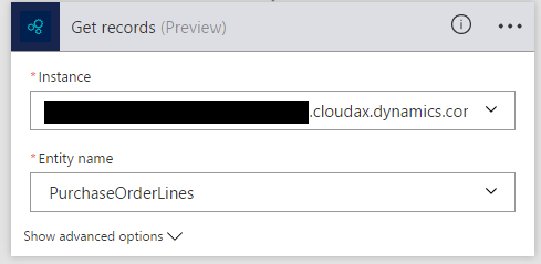 You’ll be asked to sign in if you have not used this action before. Once signed in, select the D365 instance you want to connect to, and then select the entity ‘PurchaseOrderLines’
