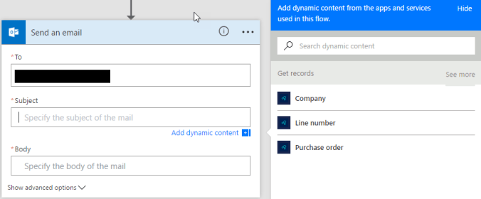 Note what happens when you click on a field. Our send action is automatically embedded within a ‘Apply to each’ loop – this will iterate over all the records we select from D365, and send one email for per past due purchase order line.
